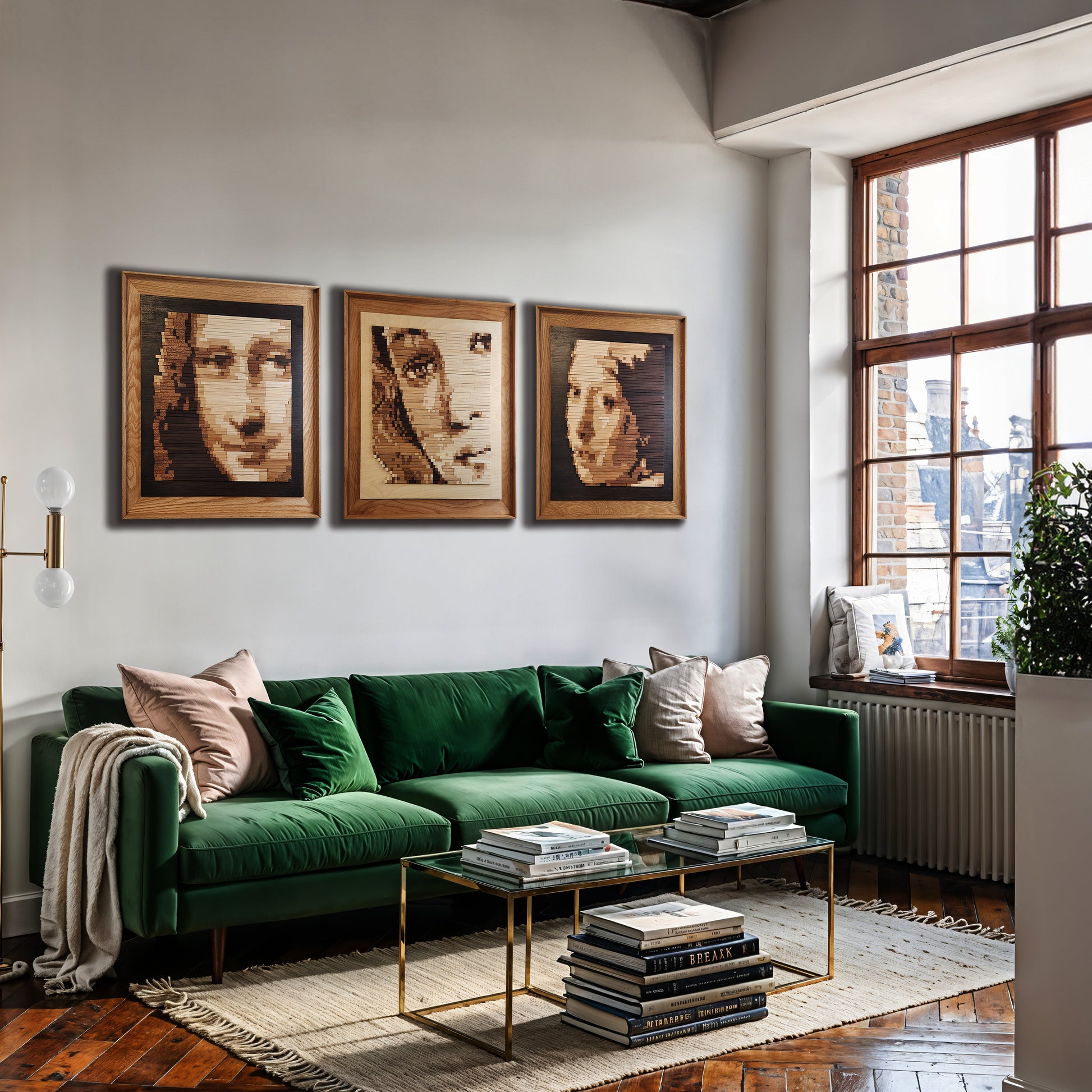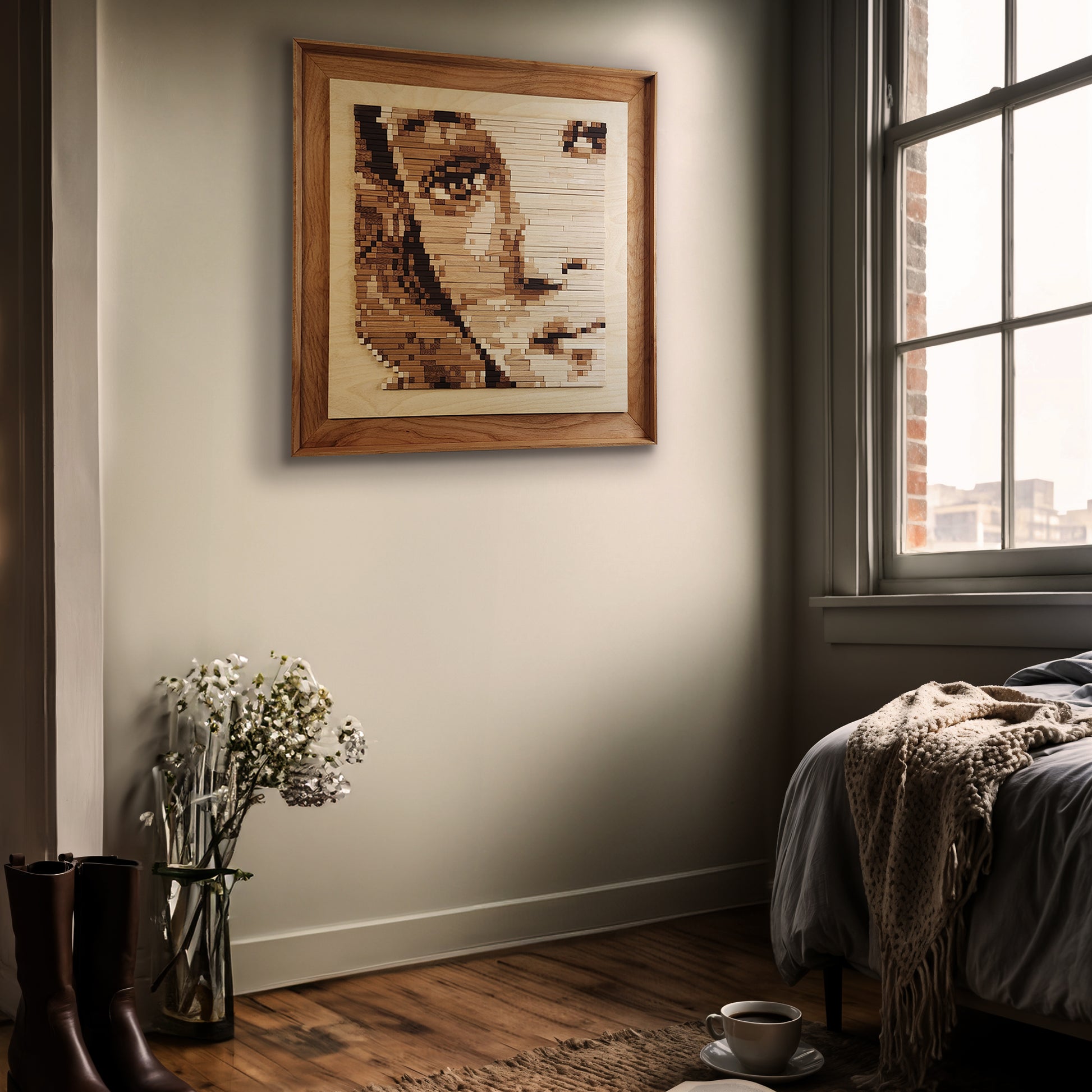 Created from a 1485 (year) Botticelli painting, this mosaic piece is made from 100% Zero-Waste wood using Peruvian Walnut, African Edinam, American Cherry, Beech and Hard Maple species that are remnants from the milling of wood to create frame molding (I have created hundreds of Zero-Waste wood frames). Wood species were selected specifically to create natural hue and value shifts in defining her portrait.