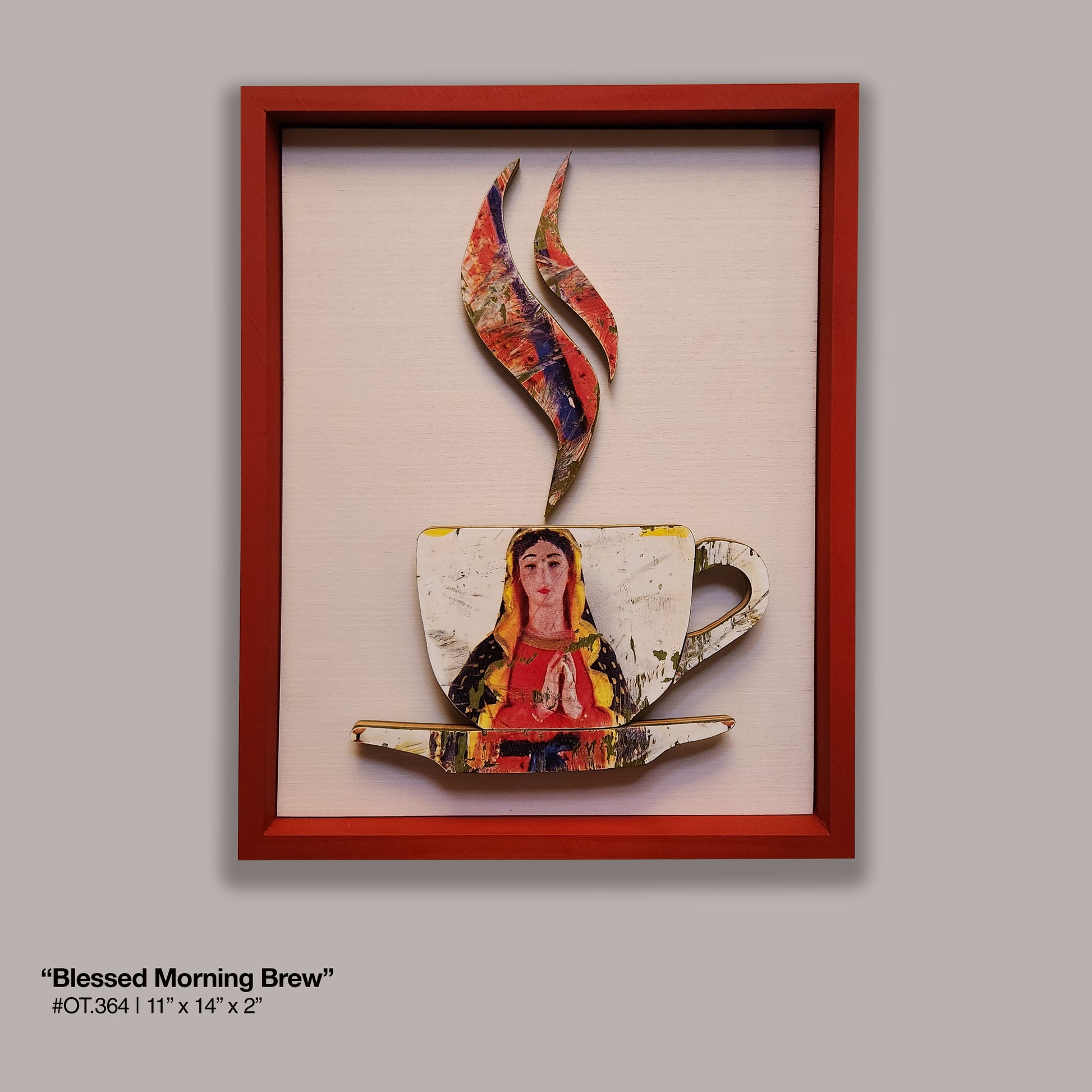 Mug and steam are cut from a repurposed skateboard deck, mounted to painted birch plywood, then mounted in a shadowbox frame that's painted Rust. Artwork dimensions are on the photo.