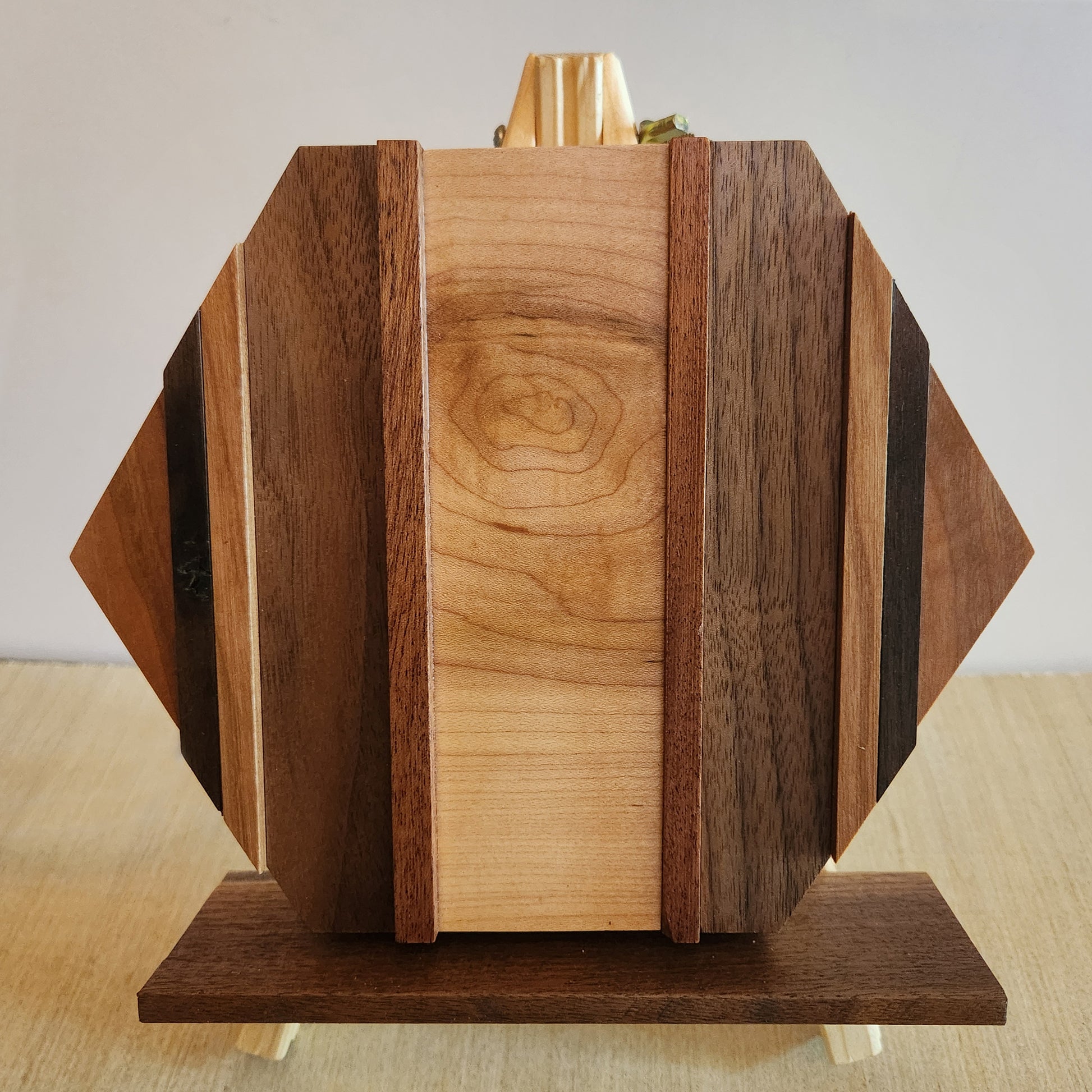 Mid-Mod Wireless Phone Charger - custom made art from Zero-Waste Wood on a pine and walnut easel that is deep enough to hold phones with a case and even a thin grip on its back. Sizes are noted on the 3rd image. Piece comes complete with AC adapter and is ready to use out of the box.