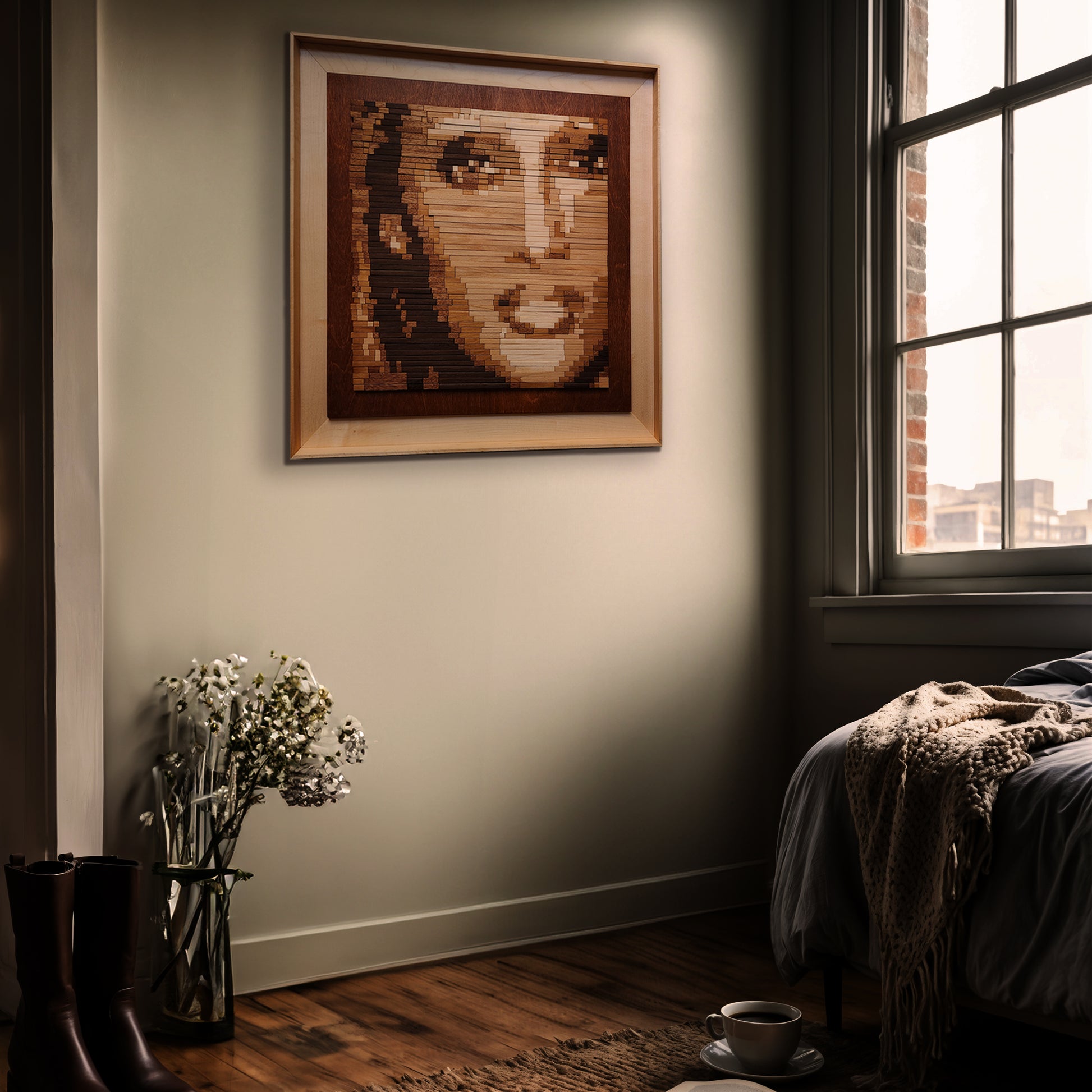 "Model of the Year" is created from a 1966 promotional photo of Iman by Vogue magazine when they named her "Model of the Year" (Iman was the first native African woman to receive this honor, she is also known for her marriage to David Bowie from 1992 until his death in 2016). This mosaic piece is made from 100% Zero-Waste wood using Peruvian Walnut, African Edinam, American Cherry, Beech and Hard Maple species that are remnants from the milling of wood used to create frame molding (I have created hundreds of Zero-Waste wood frames). Wood species were selected specifically to create natural hue and value shifts in defining her portrait.