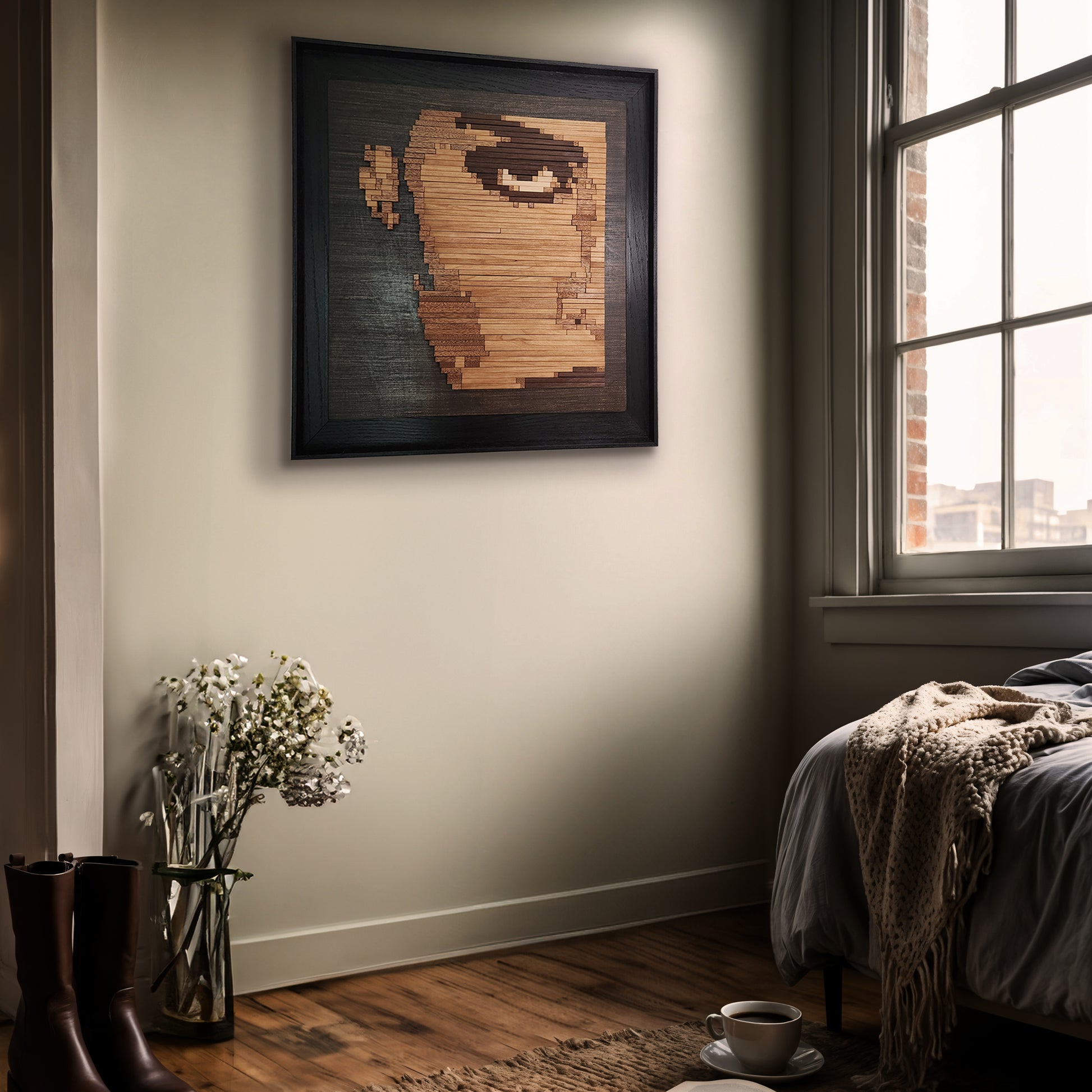"The Blackest Day" is created from a promo photo of Lana Del Rey that supported the song of the same name from 2015. "The Blackest Day" is from her "Honeymoon" album. This mosaic piece is made from 100% Zero-Waste wood using Peruvian Walnut, African Edinam, American Cherry, Beech and Hard Maple species that are remnants from the milling of wood used to create frame molding (I have created hundreds of Zero-Waste wood frames). Wood species were selected specifically to create natural hue and value shifts in defining her portrait.