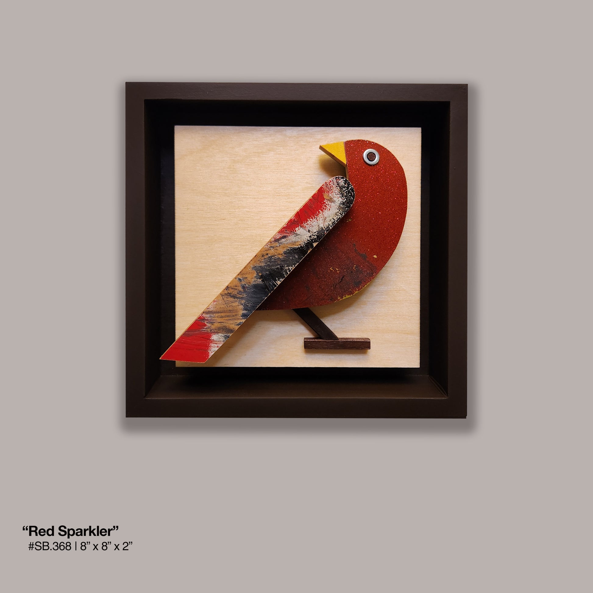 Bird is cut from 2 repurposed skateboard decks, mounted to a clear-coated birch panel, then mounted in a shadowbox frame that's painted Mocha. Artwork dimensions are on the photo.