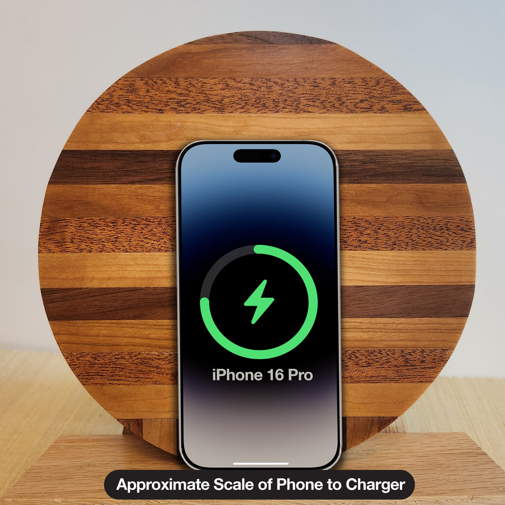 Mid-Mod Wireless Phone Charger - custom made art from Zero-Waste Wood on an oak easel that is deep enough to hold phones with a case and even a thin grip on its back. Sizes are noted on the 3rd image. Piece comes complete with AC adapter and is ready to use out of the box.