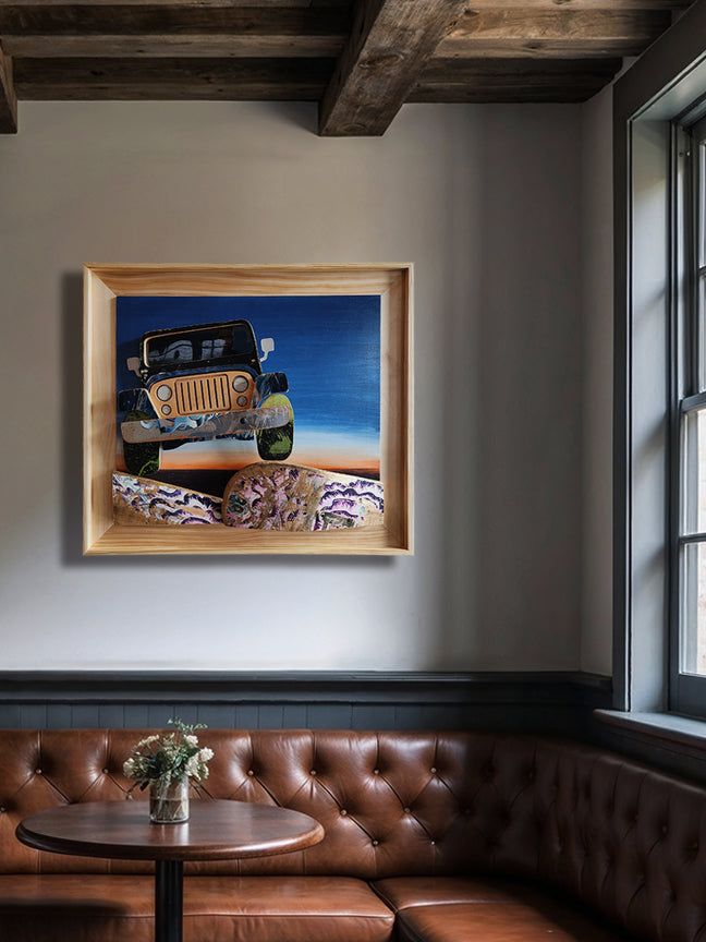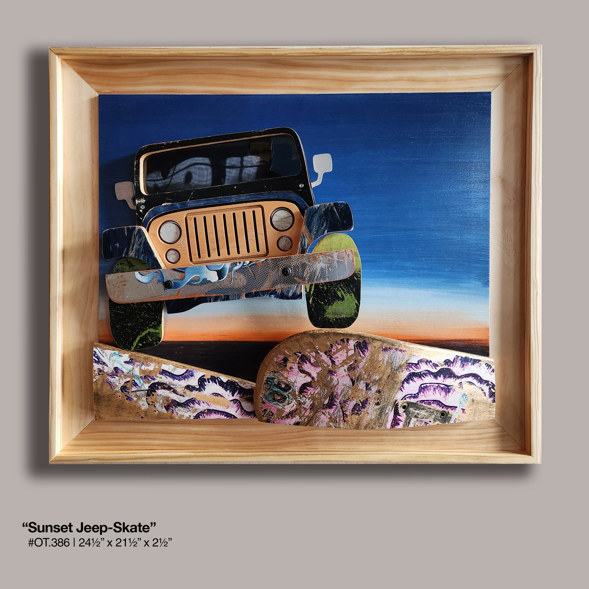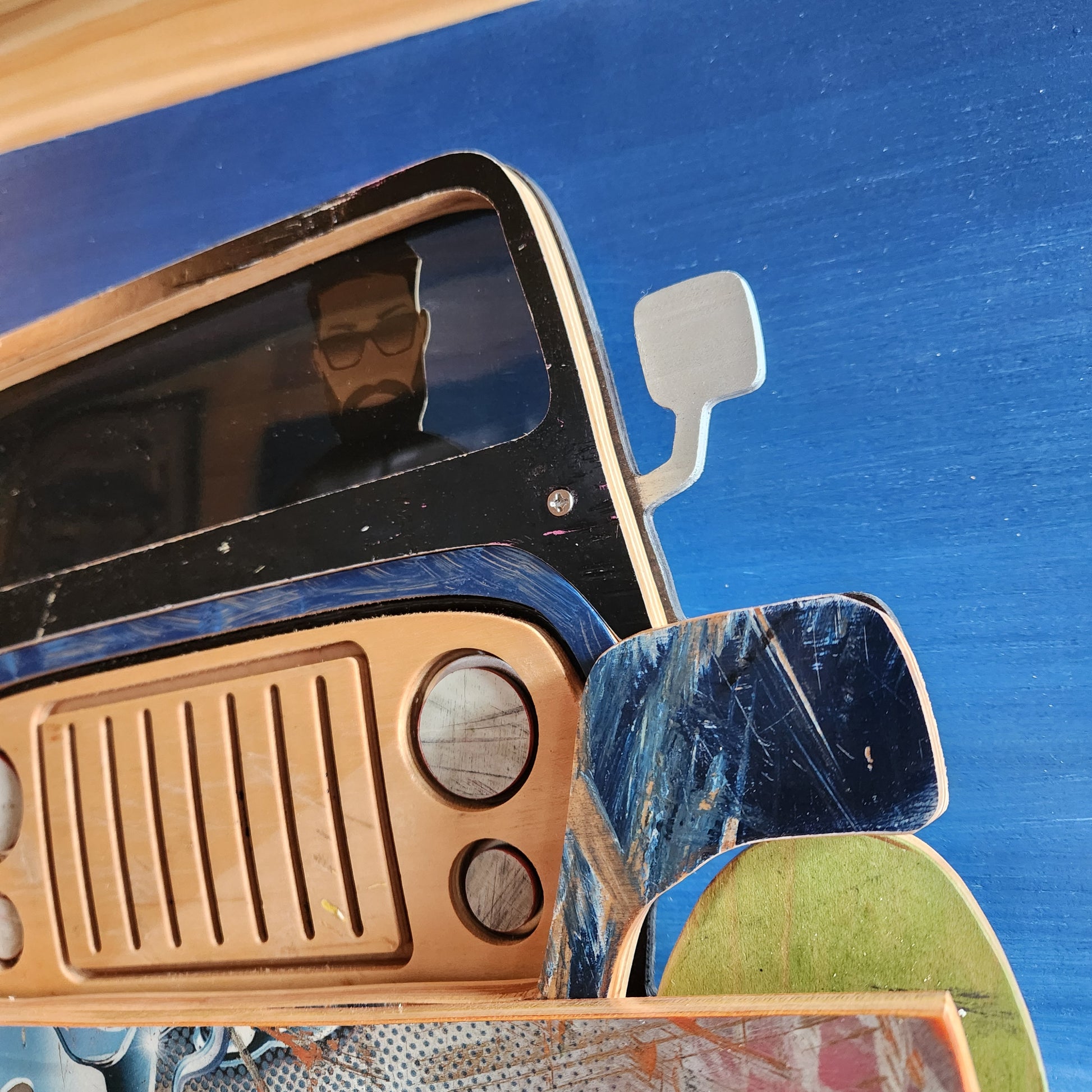 This Zero-Waste artwork was created using multiple repurposed skateboards cut, sanded and mounted to a painted plywood background. Custom shadowbox frame uses hand applied and buffed oil pine. Windshield uses a photo-lighting film (filter) and driver is from a reduced image of a future skateboard art piece.