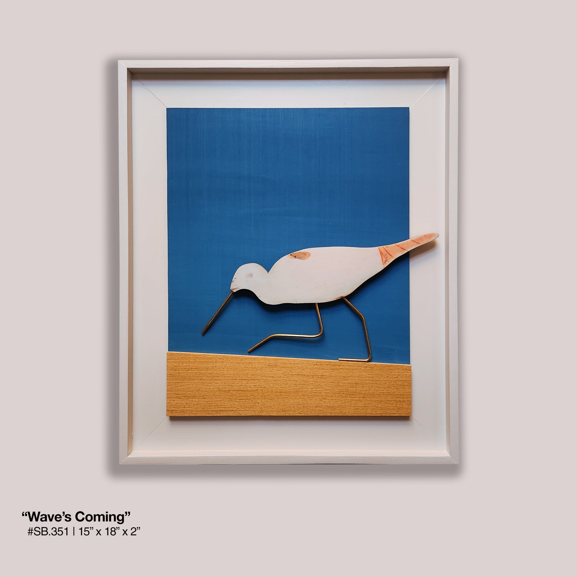 Sand Piper is cut from a single recycled skateboard and are floating on the background. Beak and leg are made from solid brass rods. Sky and sand background materials are Zero-Waste wood pieces taken from my studio space. Shadowbox frame is custom made, white painted pine. Please DM me if you are interested in custom work or would like to memorialize your favorite board as a piece of art.